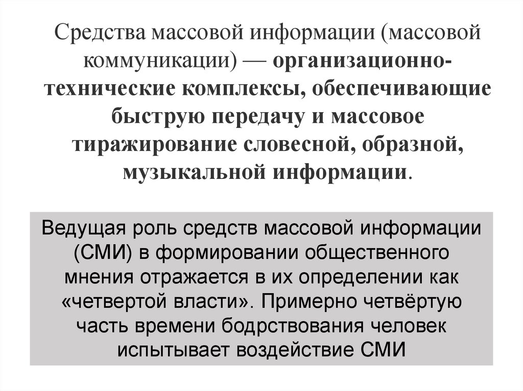 Средства массовой информации (массовойкоммуникации) — организационнотехнические комплексы, обеспечивающие