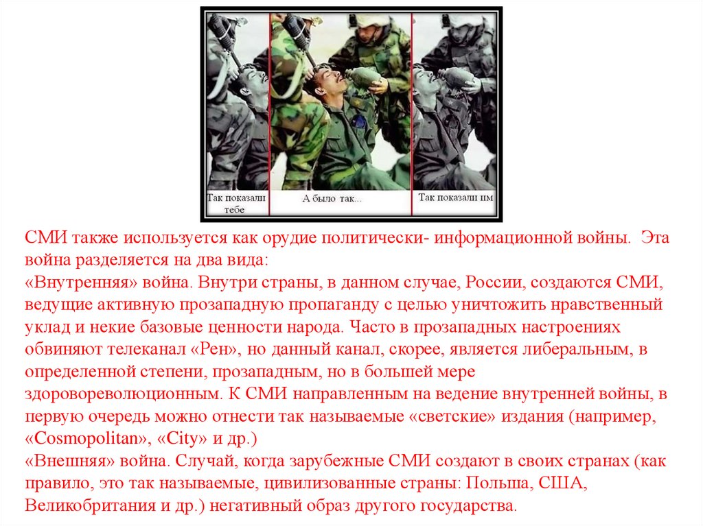 СМИ также используется как орудие политически- информационной войны. Этавойна разделяется на два вида: