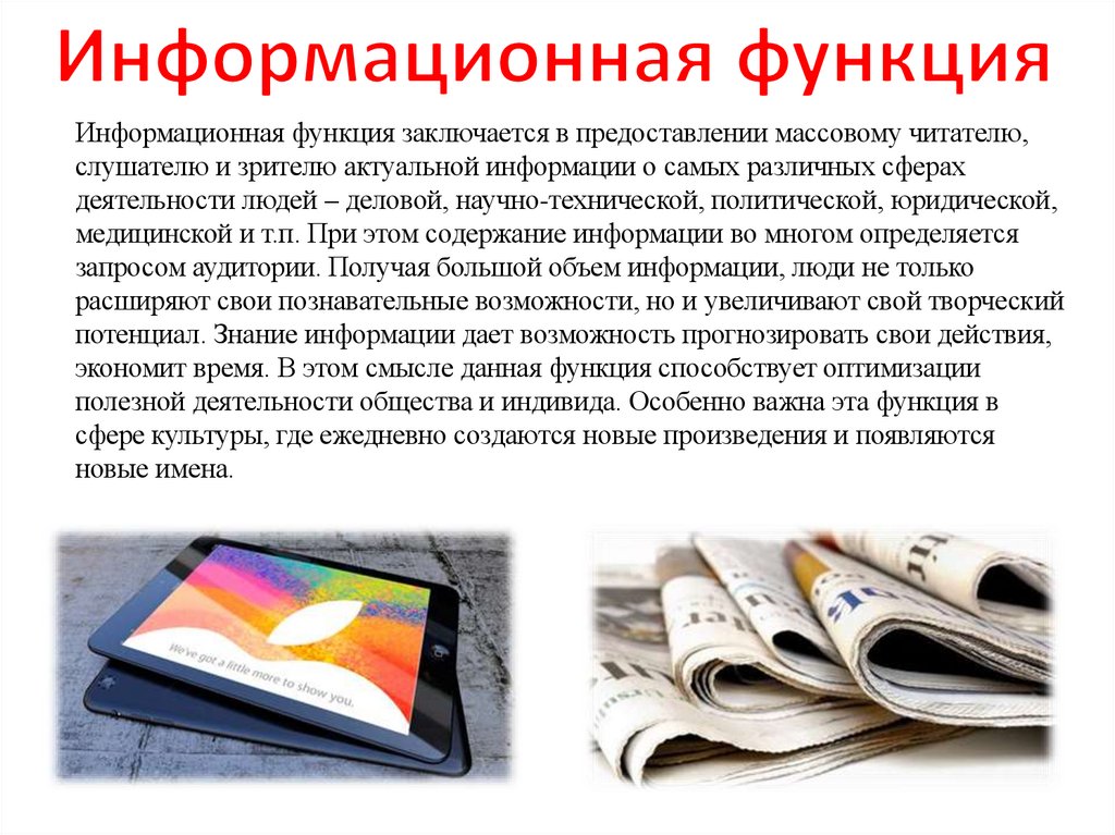 Информационная функция заключается в предоставлении массовому читателю,слушателю и зрителю актуальной информации о самых различных сферах
