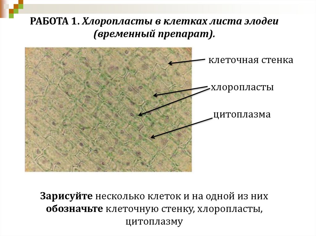 РАБОТА 1. Хлоропласты в клетках листа элодеи(временный препарат).