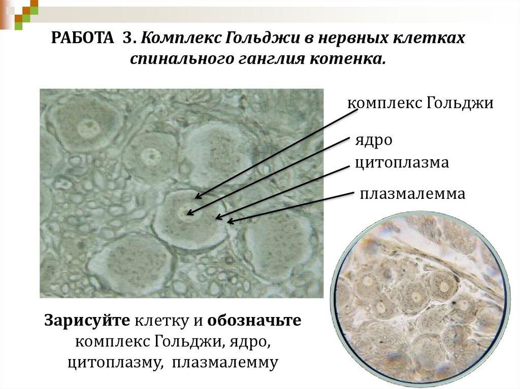 РАБОТА 3. Комплекс Гольджи в нервных клеткахспинального ганглия котенка.