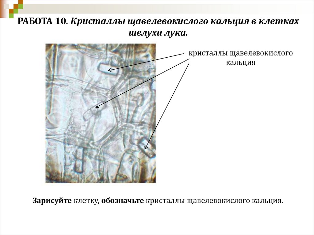 РАБОТА 10. Кристаллы щавелевокислого кальция в клеткахшелухи лука.
