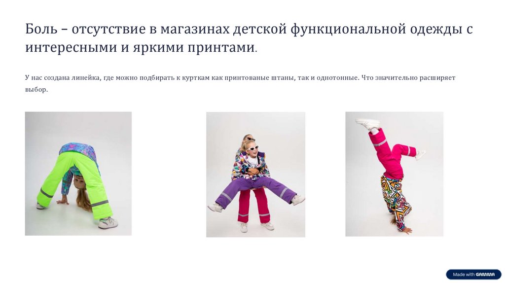 У нас создана линейка, где можно подбирать к курткам как принтованые штаны, так и однотонные. Что значительно расширяет