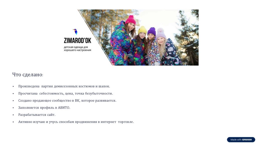 Что сделано:Произведена партия демисезонных костюмов и шапок.