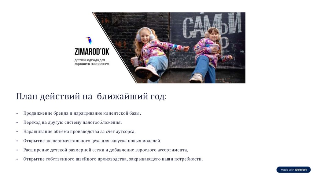 План действий на ближайший год:Продвижение бренда и наращивание клиентской базы.