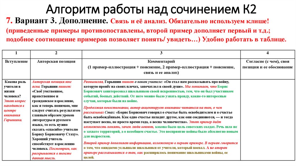 Алгоритм работы над сочинением К27. Вариант 3. Дополнение. Связь и её анализ. Обязательно используем клише!
