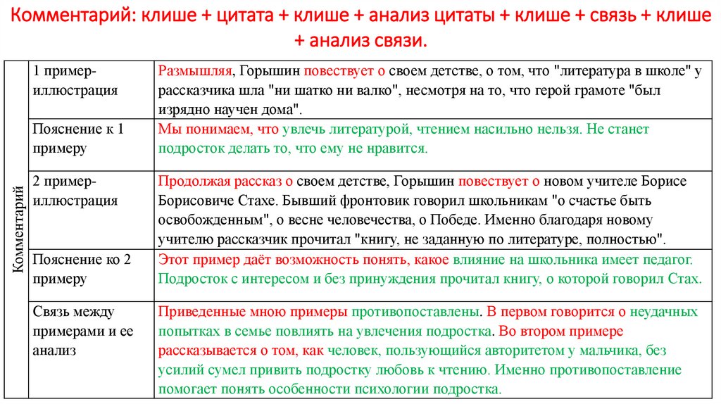 Комментарий: клише + цитата + клише + анализ цитаты + клише + связь + клише+ анализ связи.
