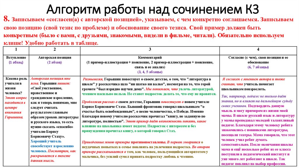 Алгоритм работы над сочинением К38. Записываем «согласен(а) с авторской позицией», указываем, с чем конкретно соглашаемся. Записываем
