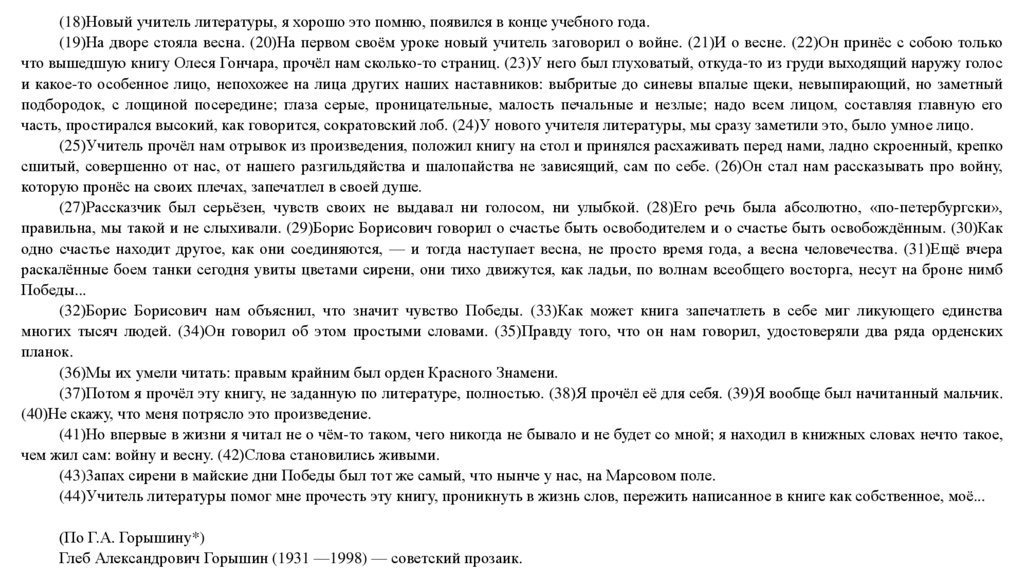 (18)Новый учитель литературы, я хорошо это помню, появился в конце учебного года.(19)На дворе стояла весна. (20)На первом своём уроке новый учитель заговорил о войне. (21)И о весне. (22)Он принёс с собою только