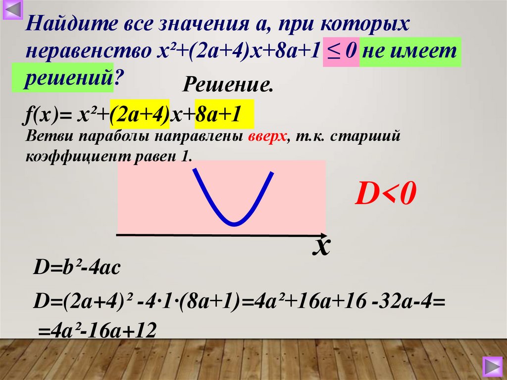 Найдите все значения а, при которыхнеравенство х²+(2а+4)х+8а+1 ≤ 0 не имеет