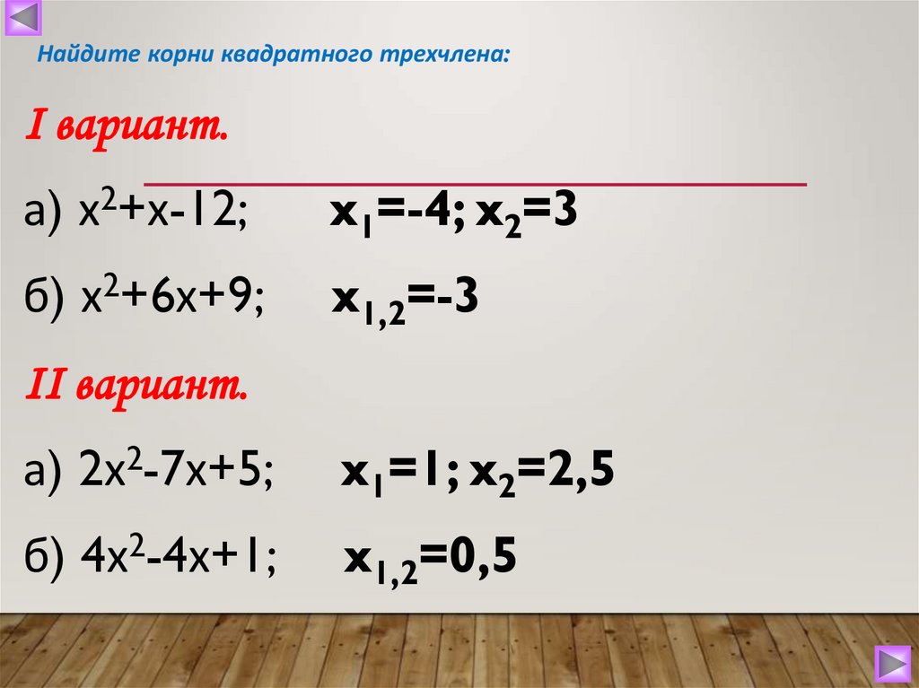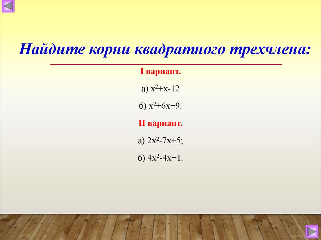 Найдите корни квадратного трехчлена:Ι вариант.