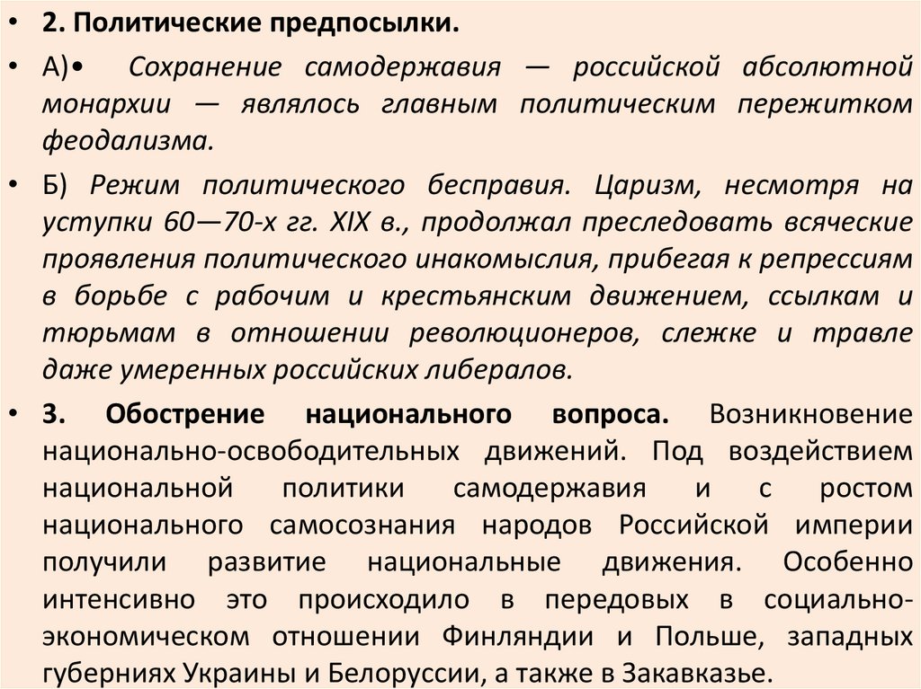 • 2. Политические предпосылки.• А)• Сохранение самодержавия — российской абсолютной
