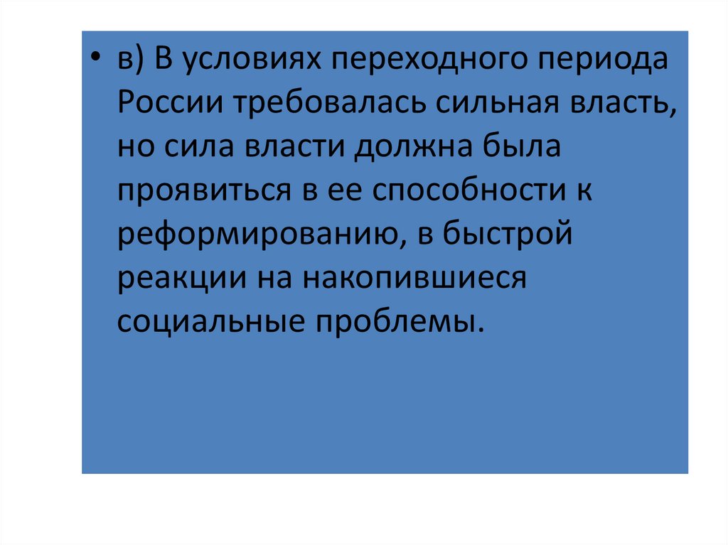 • в) В условиях переходного периодаРоссии требовалась сильная власть,