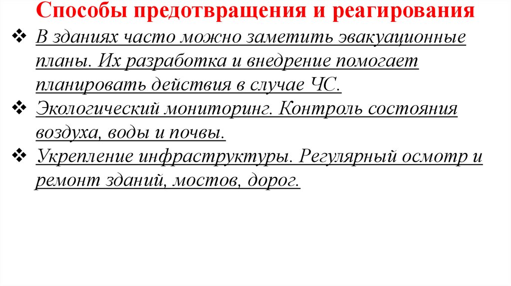 Способы предотвращения и реагированияПредотвращение ЧС происходит через регулярное