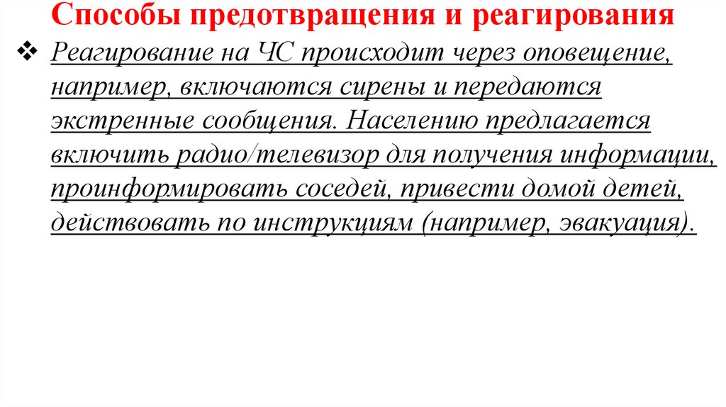 Способы предотвращения и реагированияРеагирование на ЧС происходит через оповещение,