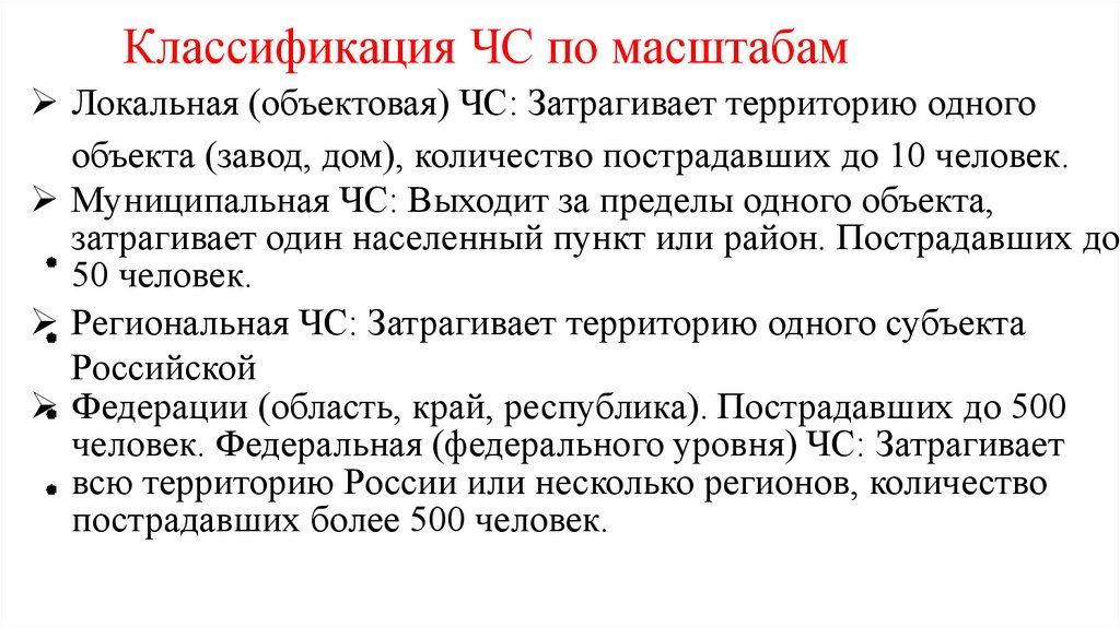 Классификация ЧС по масштабамЛокальная (объектовая) ЧС: Затрагивает территорию одного