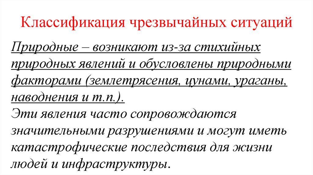 Классификация чрезвычайных ситуацийПриродные – возникают из-за стихийных