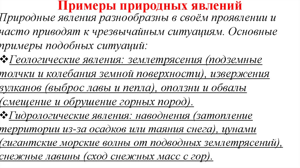 Примеры природных явленийПриродные явления разнообразны в своём проявлении и