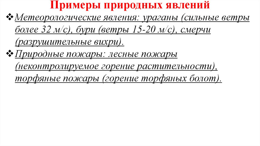 Примеры природных явленийМетеорологические явления: ураганы (сильные ветры