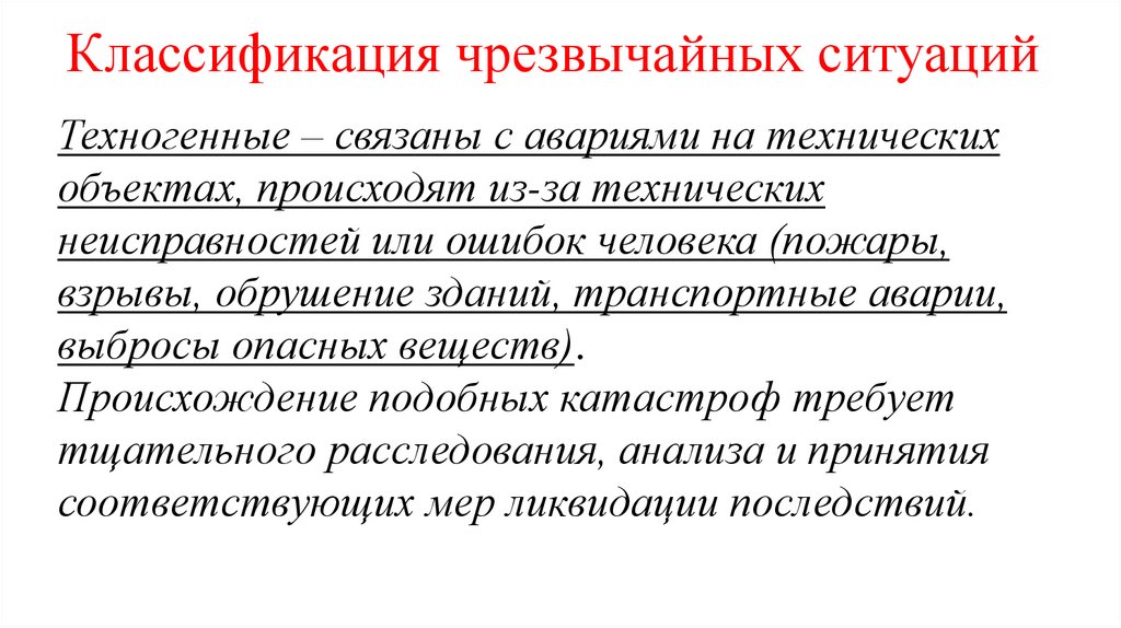 Классификация чрезвычайных ситуацийТехногенные – связаны с авариями на технических