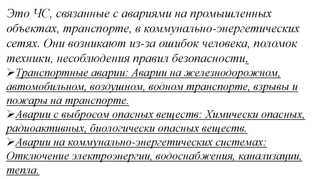 Это ЧС, связанные с авариями на промышленныхобъектах, транспорте, в коммунально-энергетических