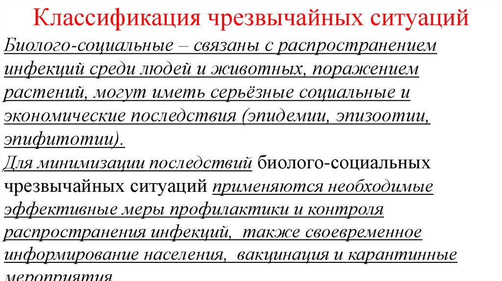 Классификация чрезвычайных ситуацийБиолого-социальные – связаны с распространением