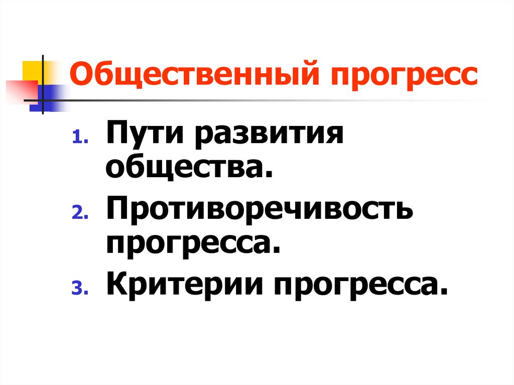 Общественный прогресс Пути развития общества. 2. Противоречивость прогресса. 3. Критерии прогресса