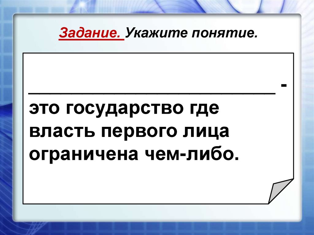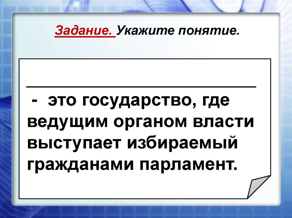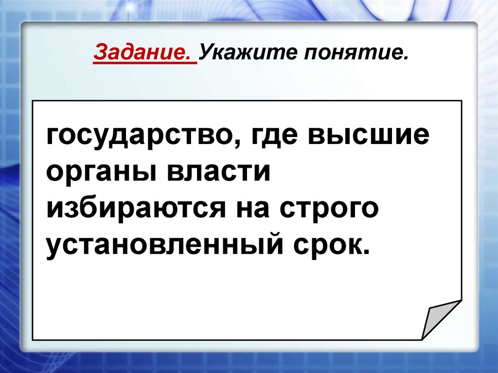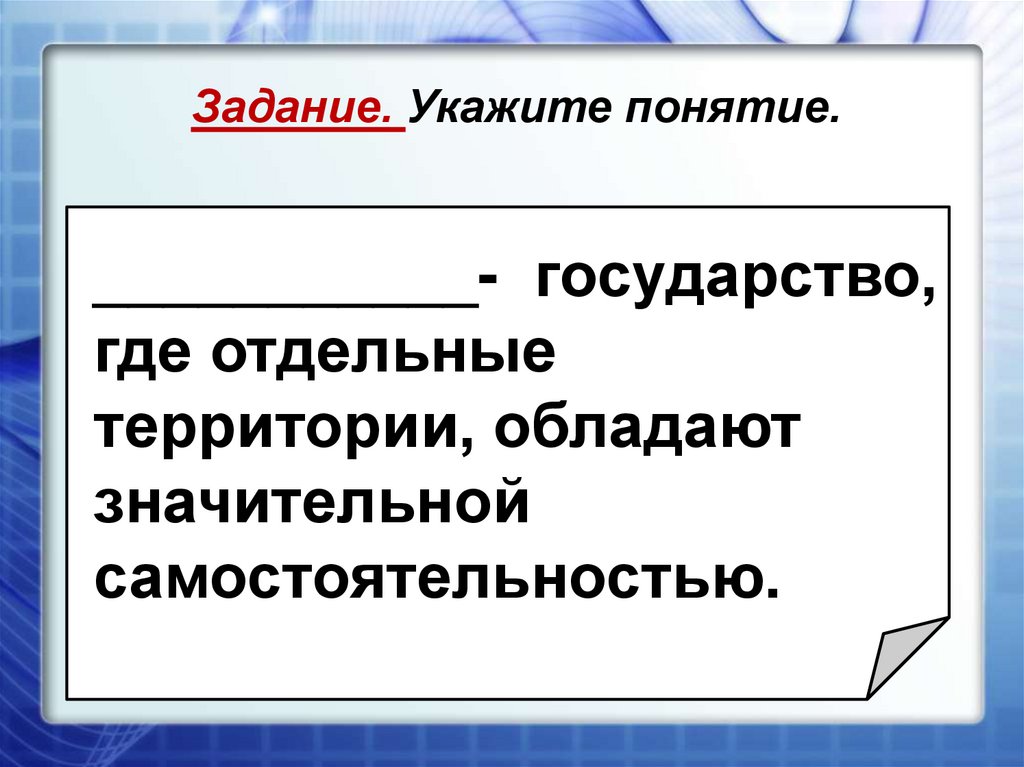 Задание. Укажите понятие.___________- государство,