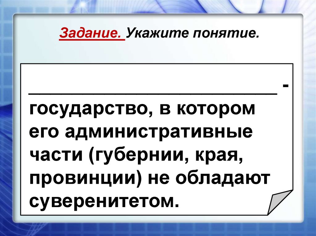 Задание. Укажите понятие._______________________ государство, в котором