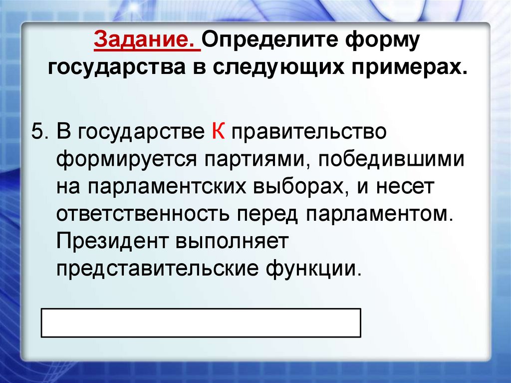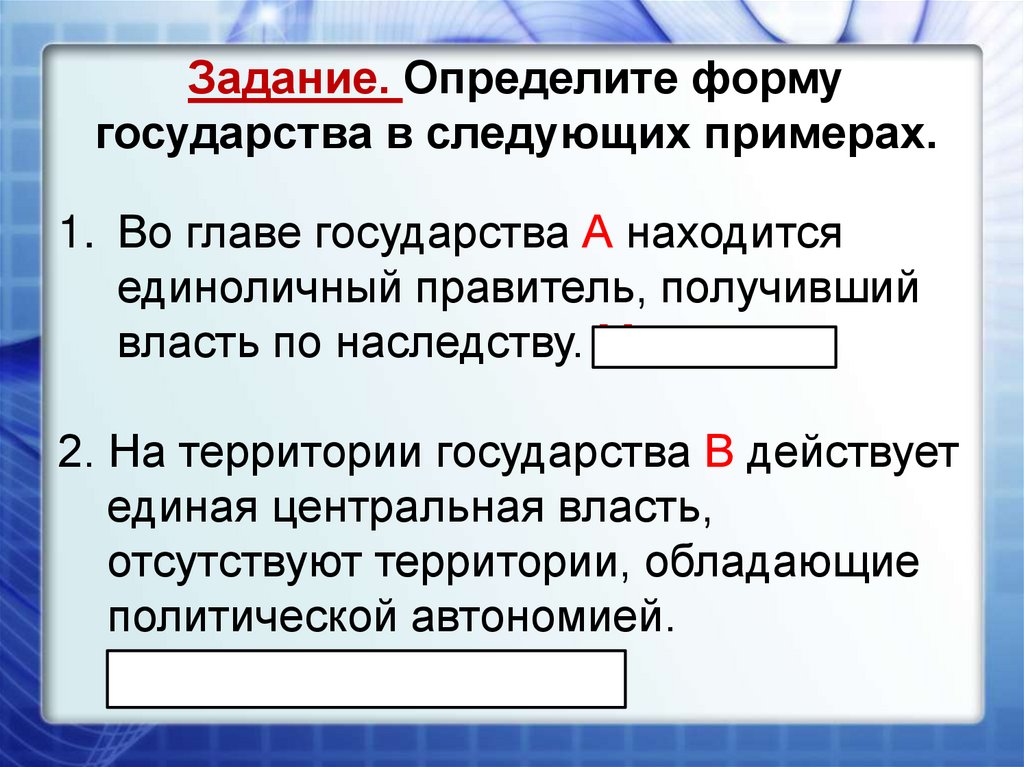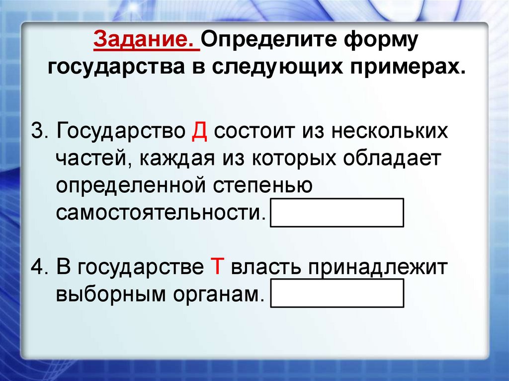 Задание. Определите формугосударства в следующих примерах.
