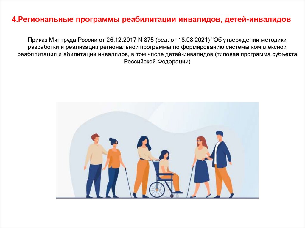 4.Региональные программы реабилитации инвалидов, детей-инвалидовПриказ Минтруда России от 26.12.2017 N 875 (ред. от 18.08.2021) "Об утверждении методики