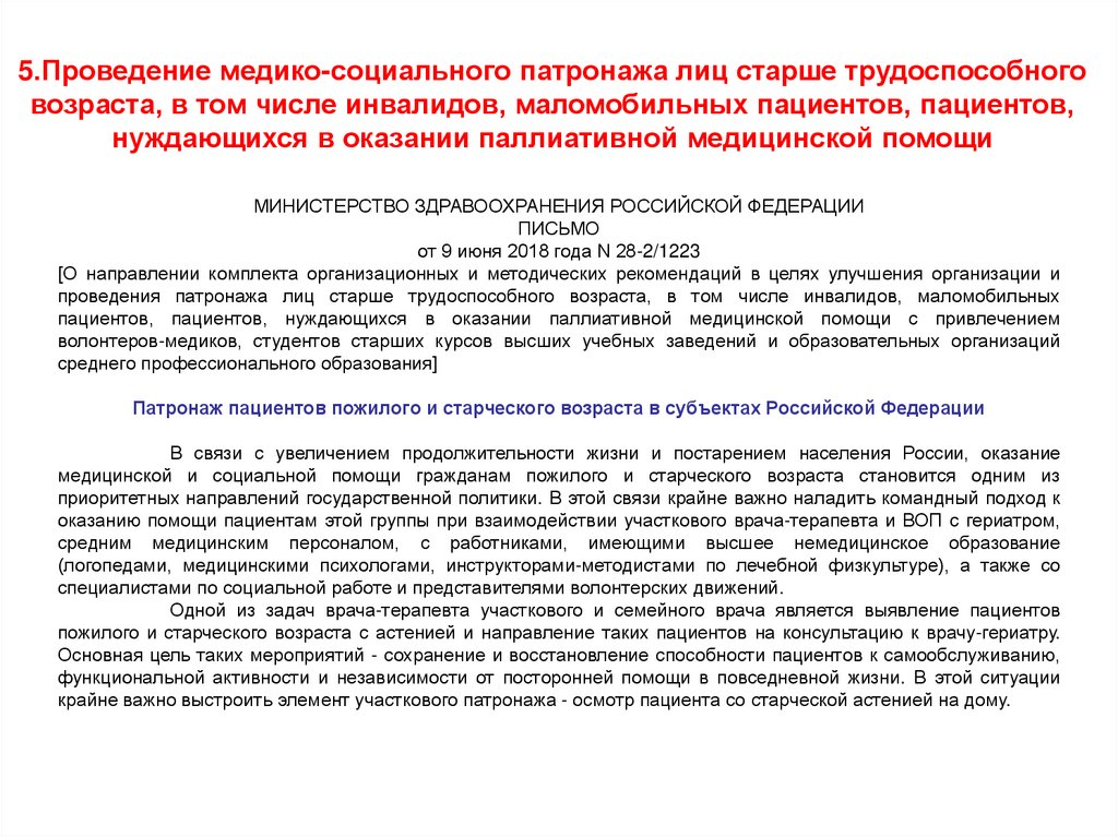 5.Проведение медико-социального патронажа лиц старше трудоспособноговозраста, в том числе инвалидов, маломобильных пациентов, пациентов,