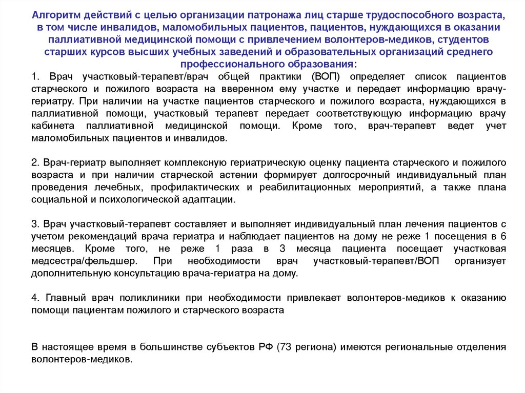 Алгоритм действий с целью организации патронажа лиц старше трудоспособного возраста,в том числе инвалидов, маломобильных пациентов, пациентов, нуждающихся в оказании