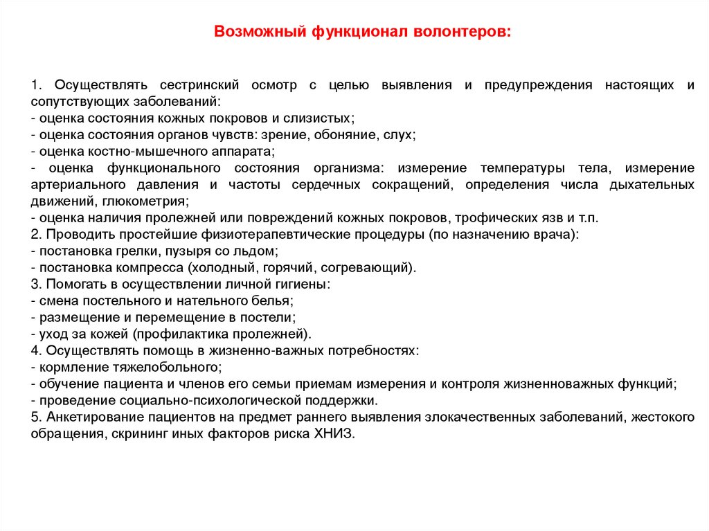 Возможный функционал волонтеров:1. Осуществлять сестринский осмотр с целью выявления и предупреждения настоящих и