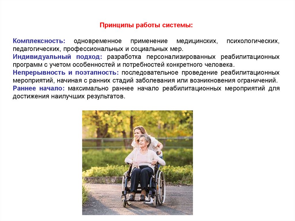 Принципы работы системы:Комплексность: одновременное применение медицинских, психологических,
