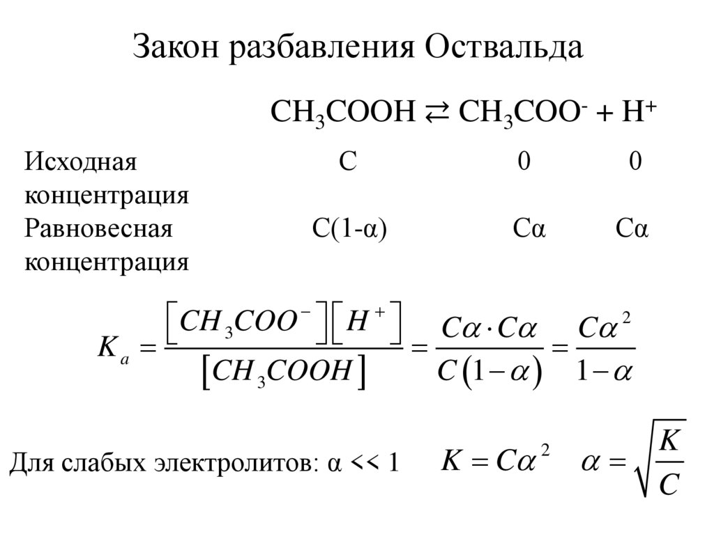 Закон разбавления ОствальдаCH3COOH ⇄ CH3COO- + H+