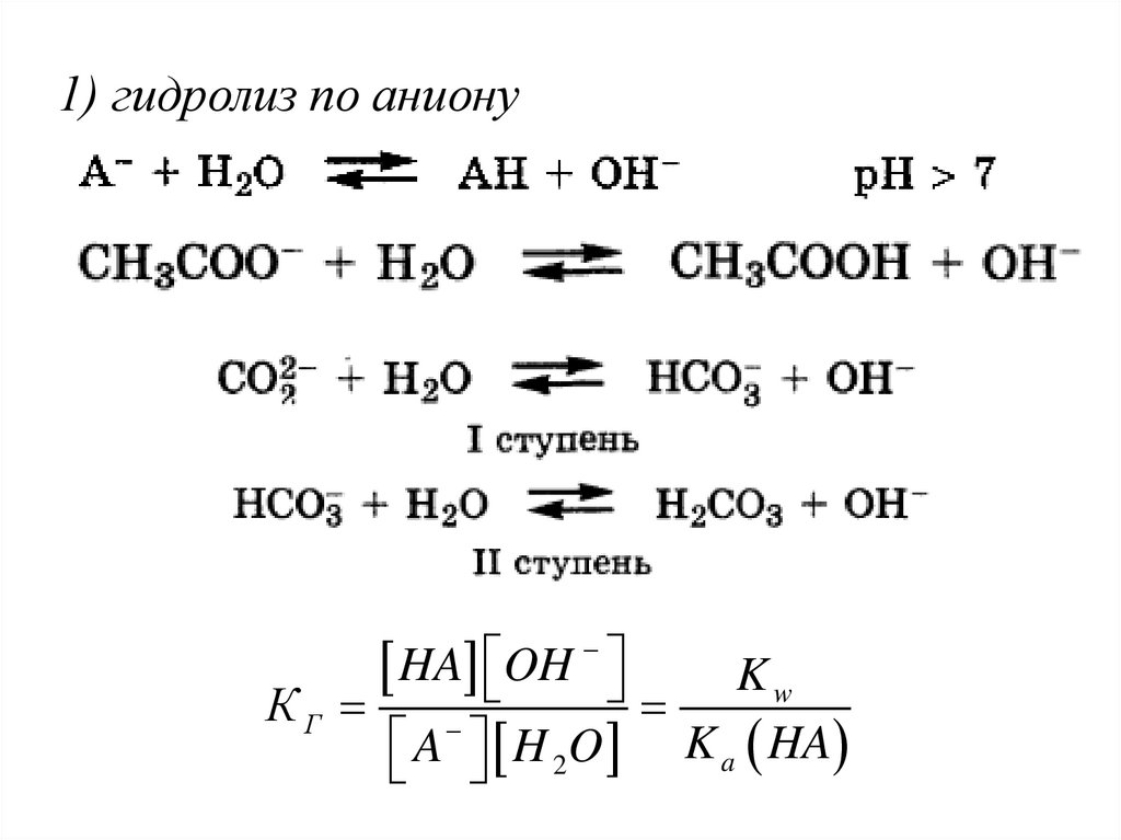 1) гидролиз по анионуHA OH