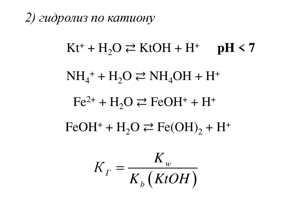 2) гидролиз по катионуKt+ + H2O ⇄ KtOH + H+