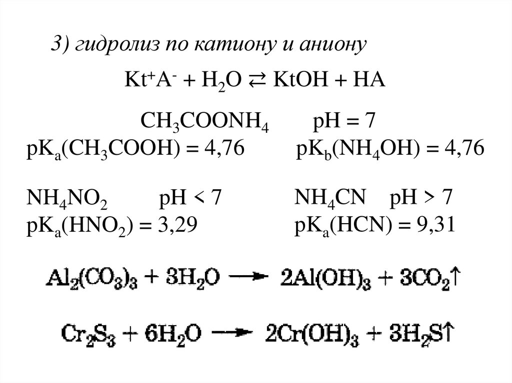 3) гидролиз по катиону и анионуKt+A- + H2O ⇄ KtOH + HA