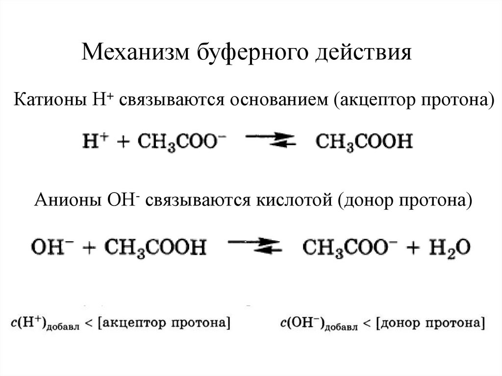 Механизм буферного действияКатионы Н+ связываются основанием (акцептор протона)