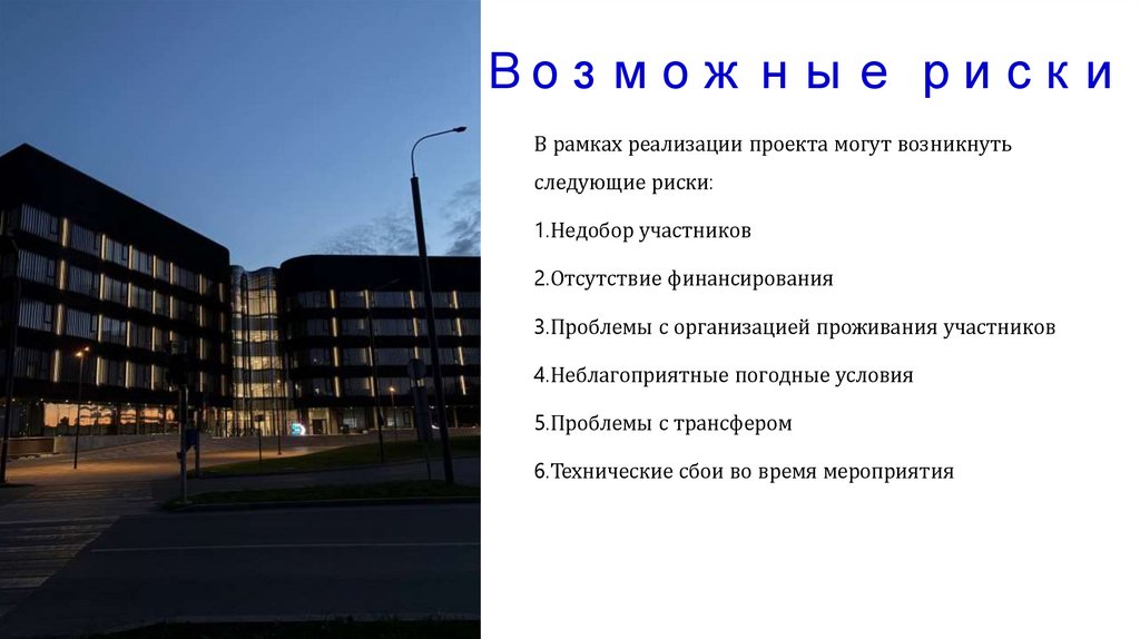 Во з м о ж н ы е ри с к иВ рамках реализации проекта могут возникнуть