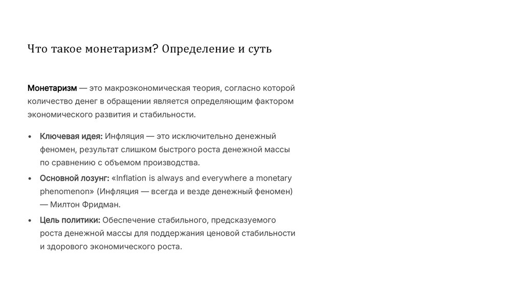 • Основной лозунг: «Inflation is always and everywhere a monetary