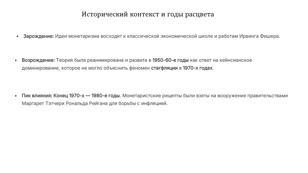 Исторический контекст и годы расцвета• Зарождение: Идеи монетаризма восходят к классической экономической школе и работам Ирвинга Фишера.