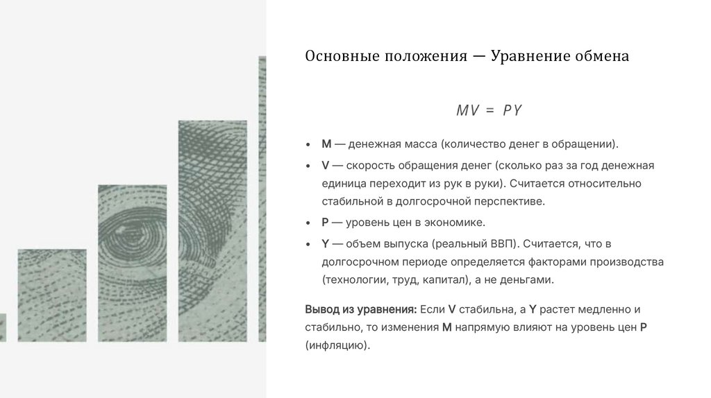 Основные положения — Уравнение обмена• M — денежная масса (количество денег в обращении).
