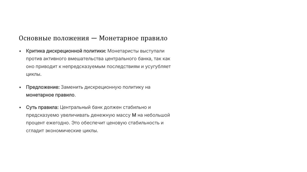 Основные положения — Монетарное правило• Критика дискреционной политики: Монетаристы выступали