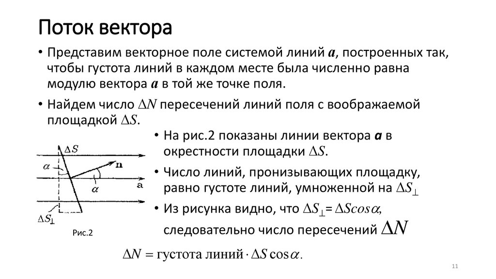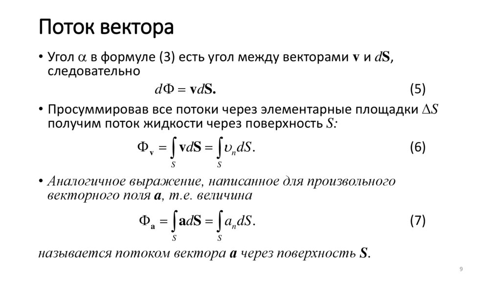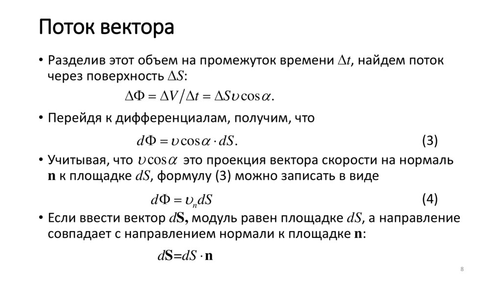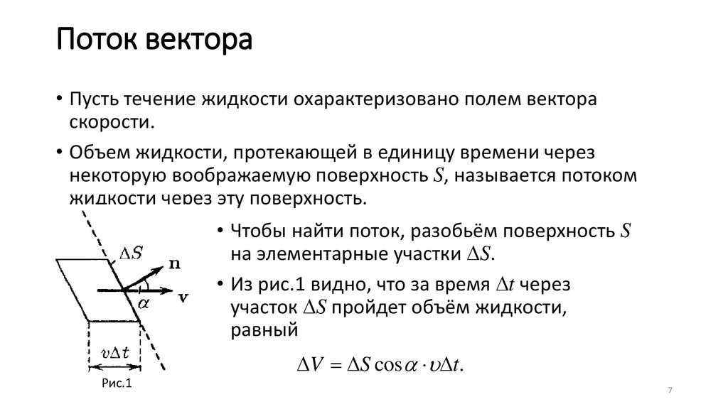 Поток вектора• Разделив этот объем на промежуток времени t, найдем поток