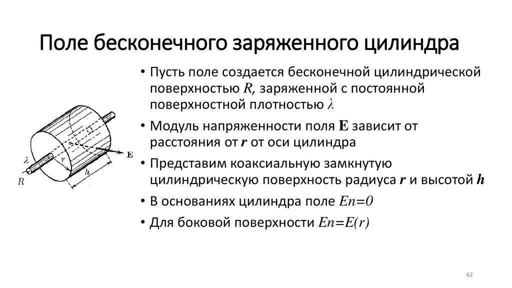 Поле бесконечного заряженного цилиндра• Пусть поле создается бесконечной цилиндрической