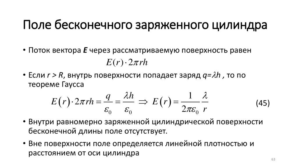 Поле бесконечного заряженного цилиндра• Поток вектора E через рассматриваемую поверхность равен