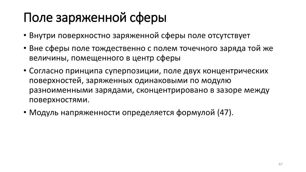 • Вне сферы поле тождественно с полем точечного заряда той же