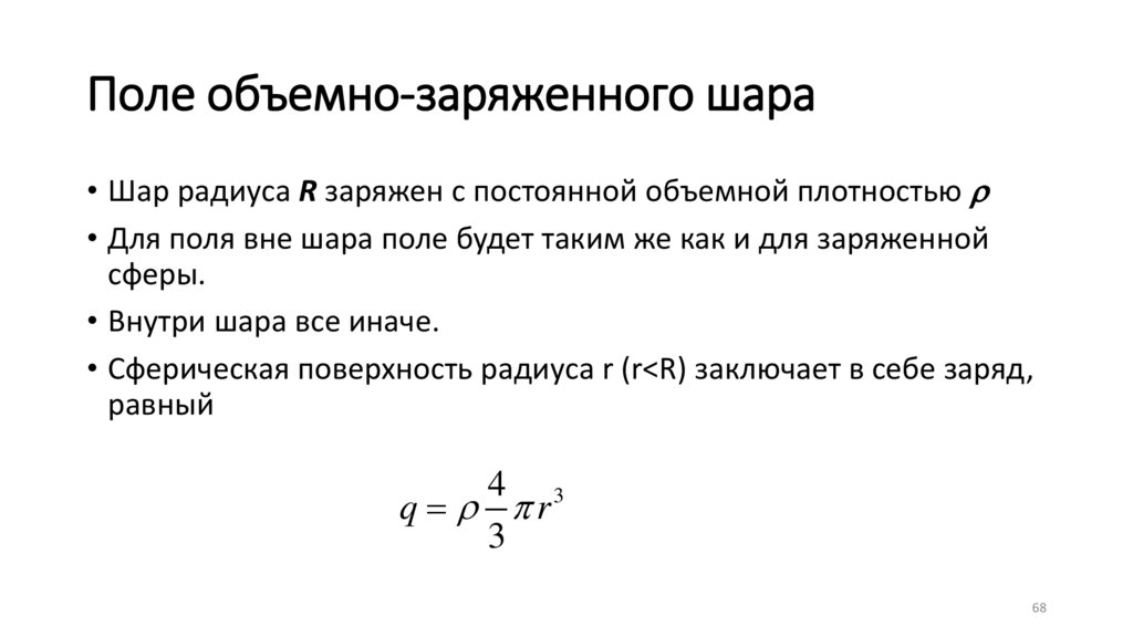 Поле объемно-заряженного шара• Шар радиуса R заряжен с постоянной объемной плотностью
